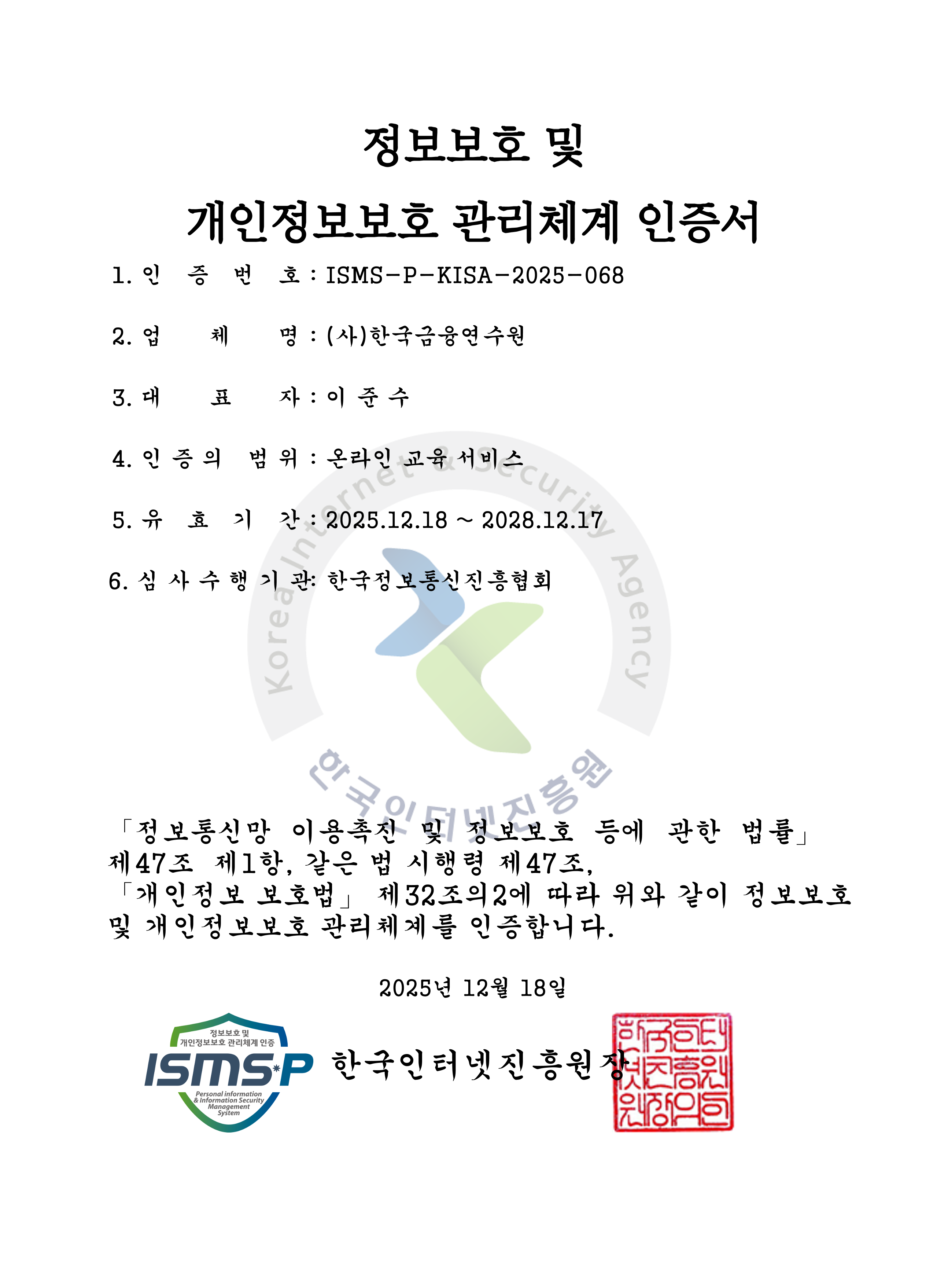 03053 서울특별시 종로구 삼청로 118 사업자등록번호: 101-82-04644 통신판매번호: 2002-00192 사업자정보 FAX: 02-3700-1520 전자우편: privacy@kbi.or.kr 상호명: 사단법인 한국금융연수원 대표자: 이 준 수 ⓒ KOREA BANKING INSTITUTE. ALL RIGHTS RESERVED